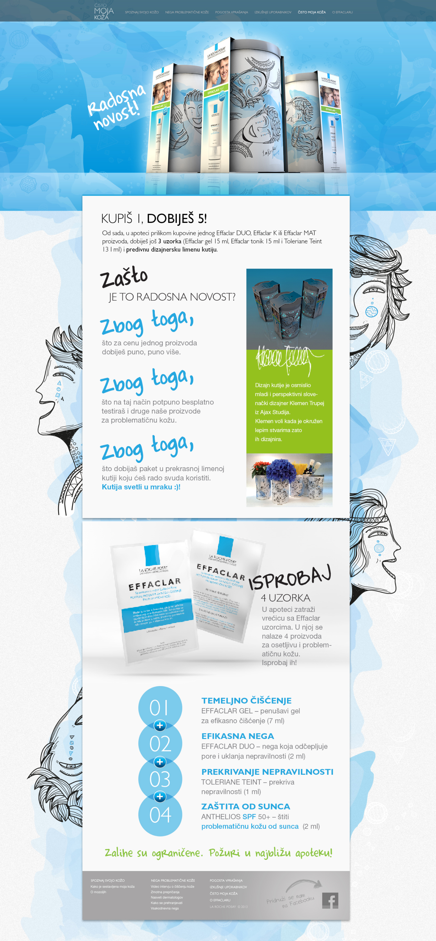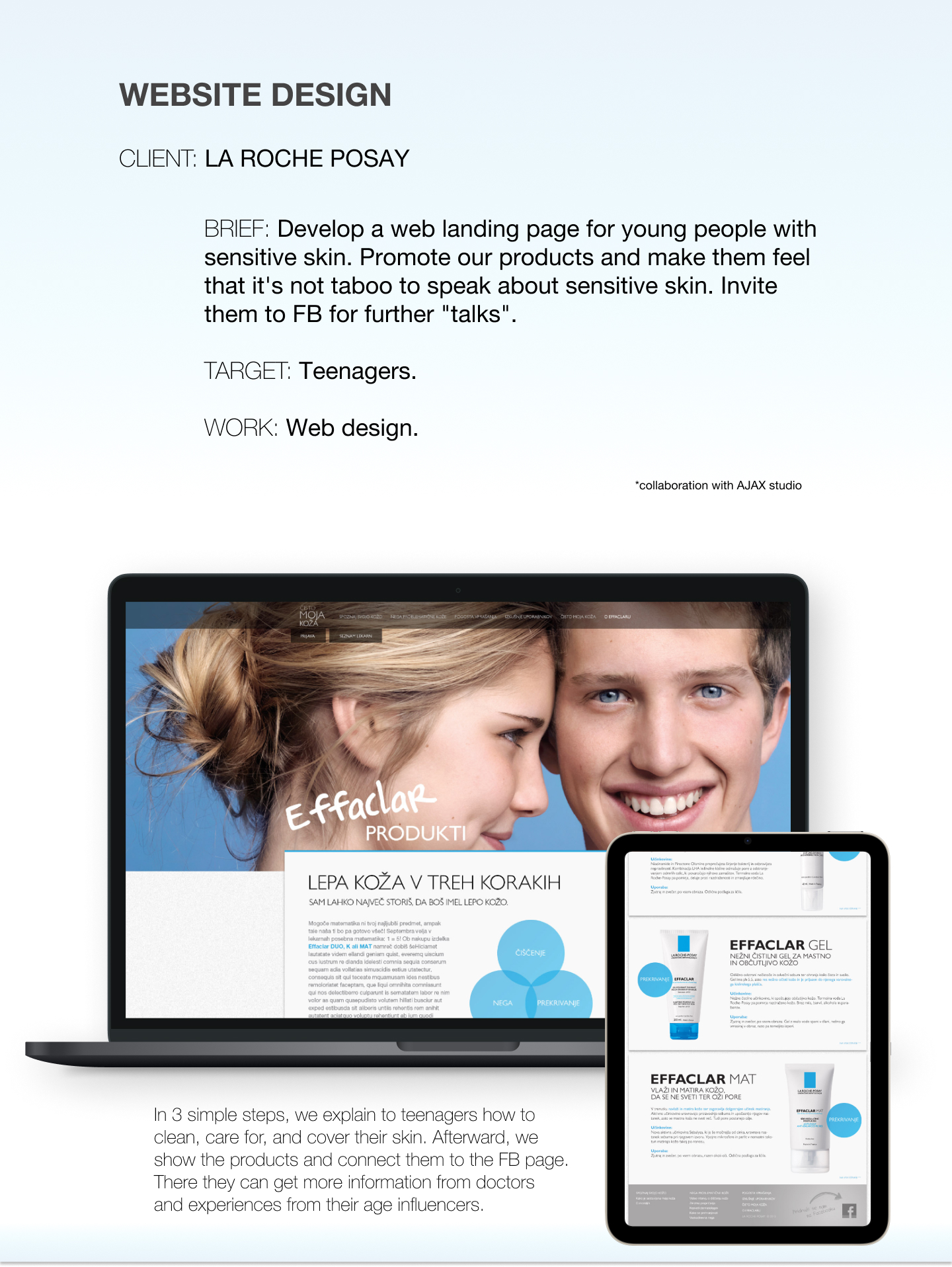 A web landing page encourages young people to discuss their skin problems openly. We presented a three-step cleaning, care, and skin coverage process, including free illustrated samples.